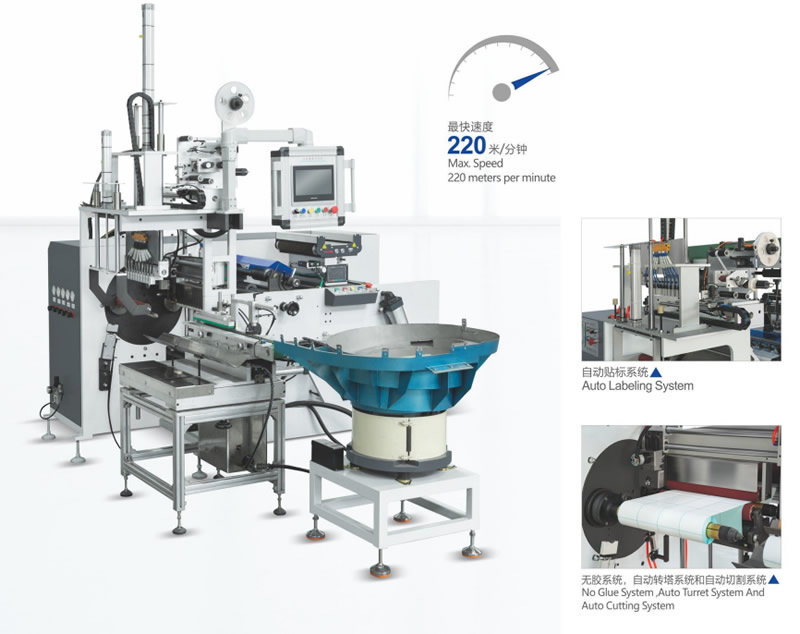 此機最高速度:220米/分,采用匯川控制系統(tǒng)(7個同服+運動控制器),配備分切、自動套紙管、自動飛刀、自動貼標紙管無膠、無折痕、計數(shù)、記米等功能。